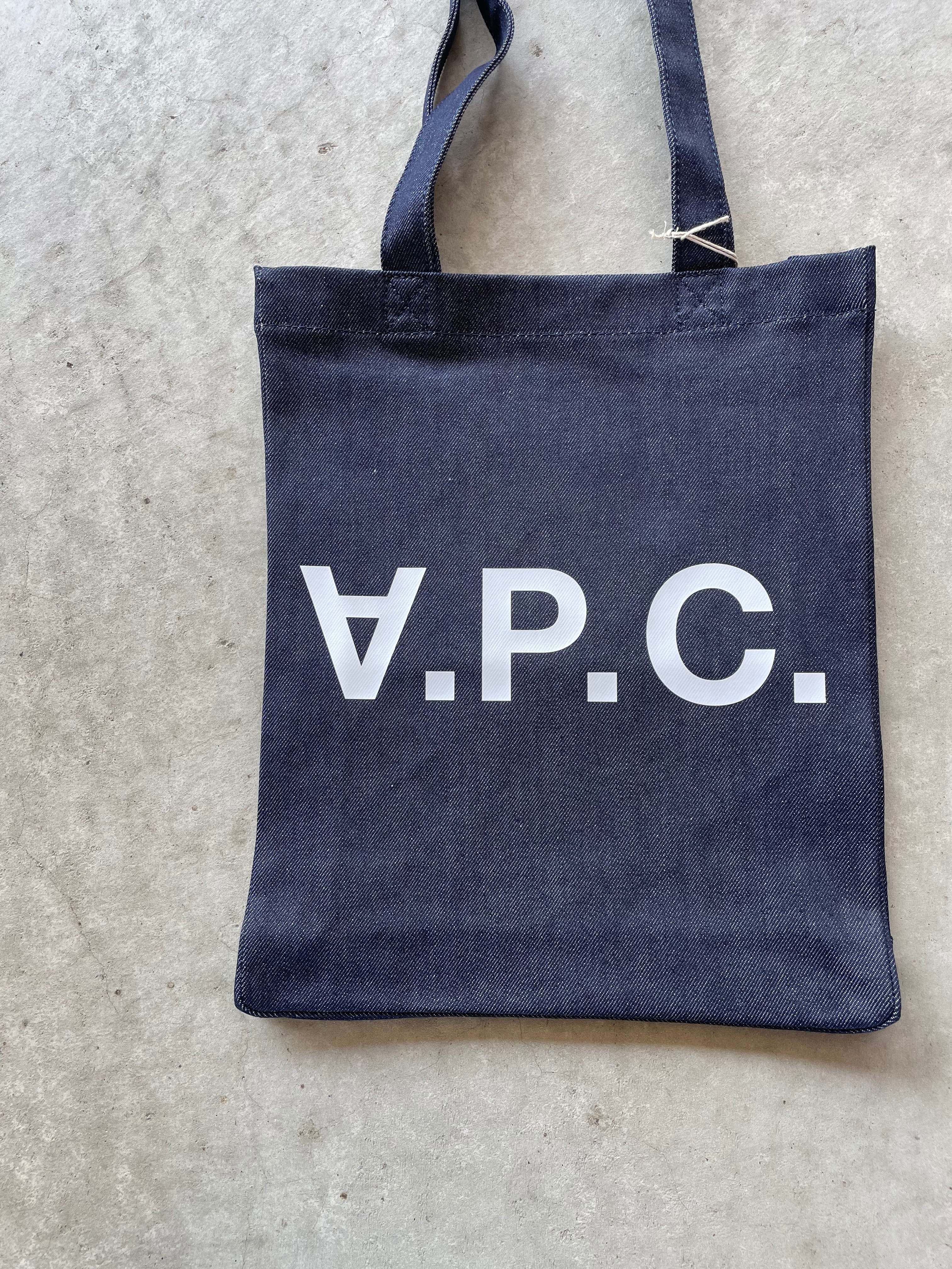 デニム生地のトートバッグ。肩掛け可能な大きな持ち手と、V.P.C.プリントが特徴です。