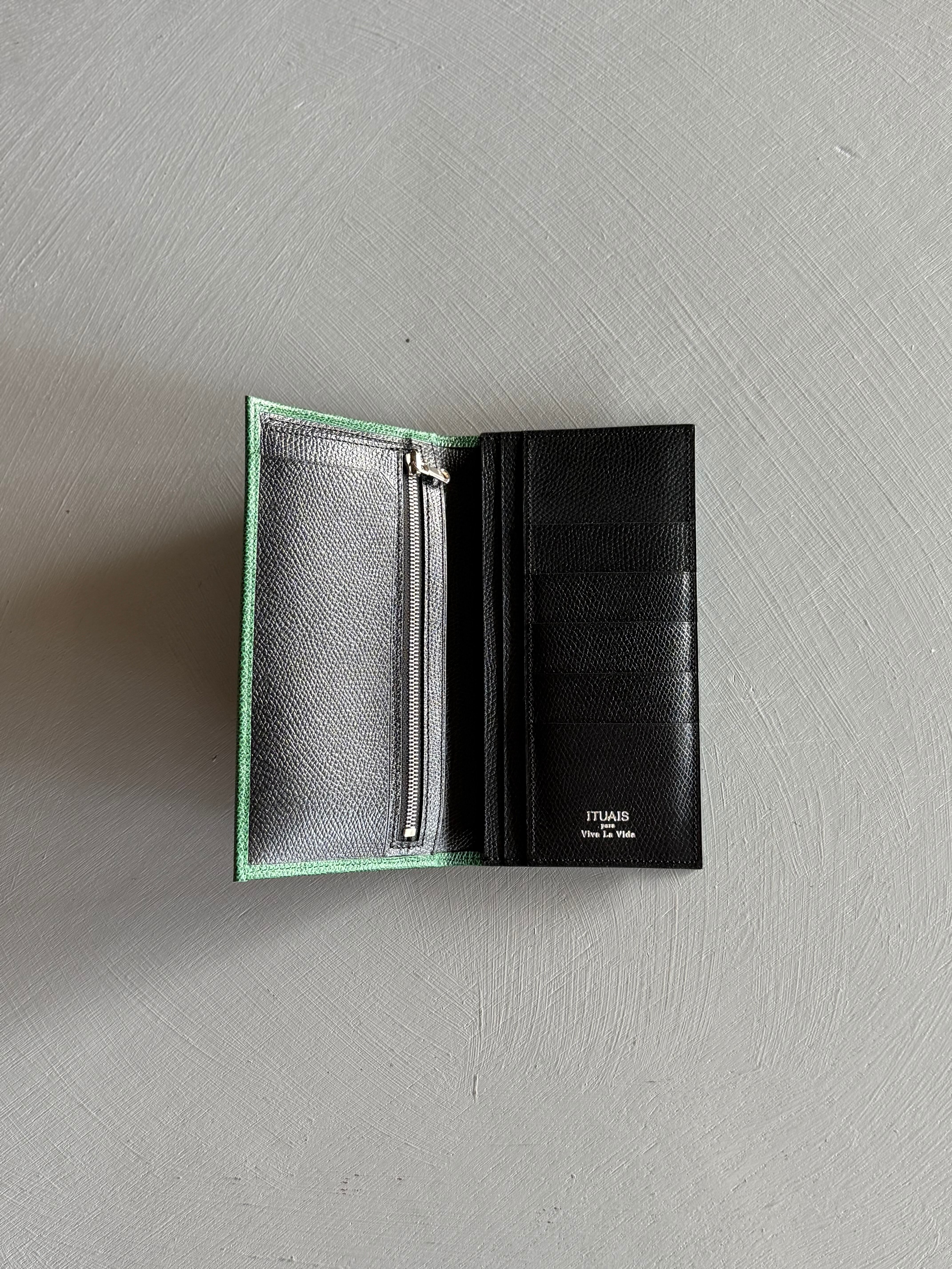 お札や通帳が入り、小銭入れのファスナーはイタリアで120年続くLAMPO社の物が使われた非常に上品で大人なデザインに仕上がっています。