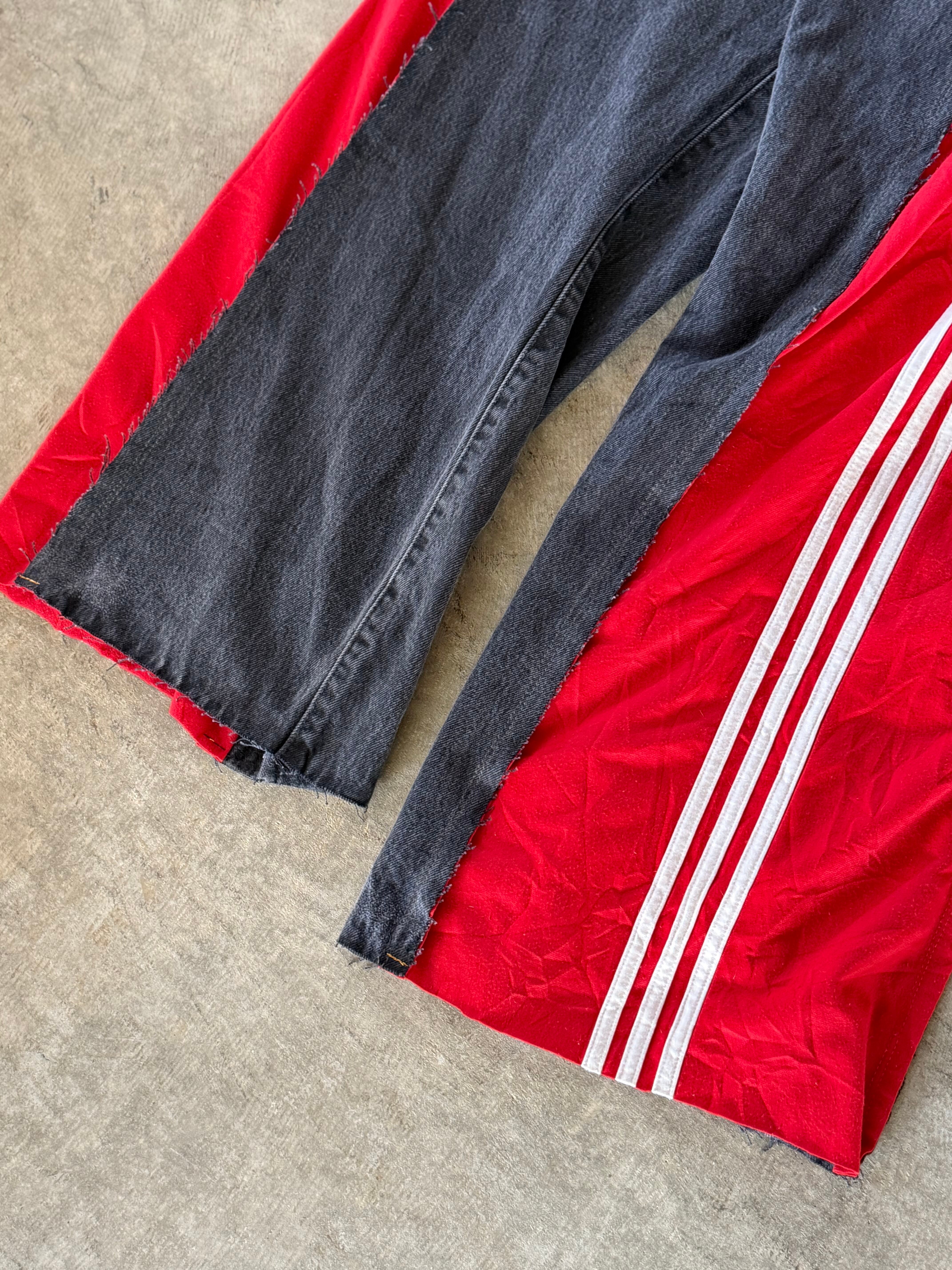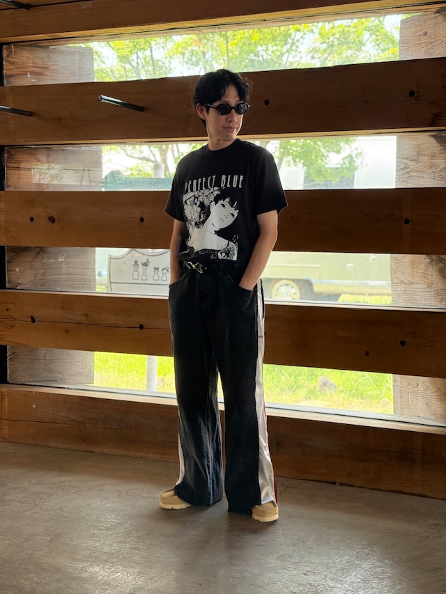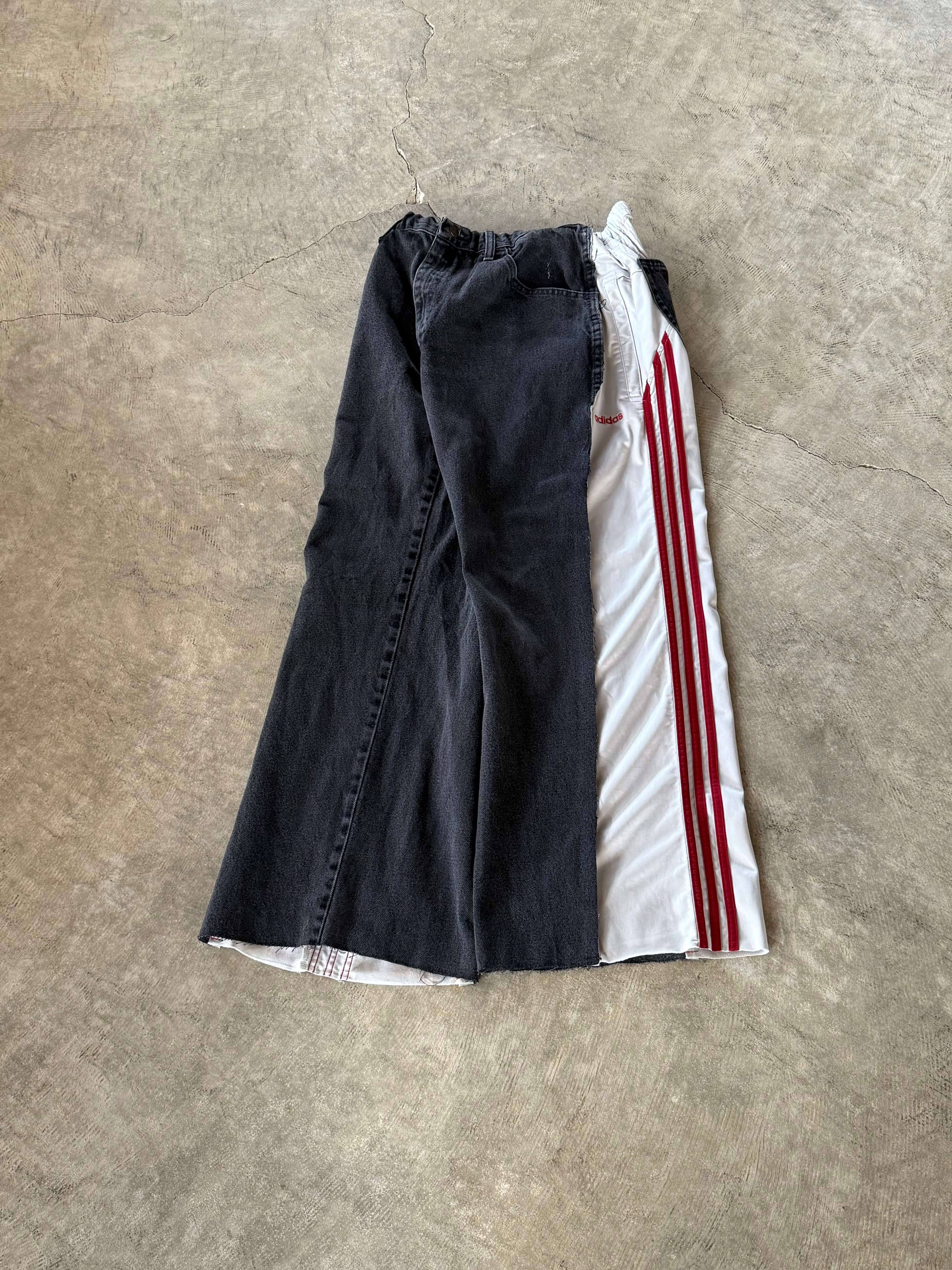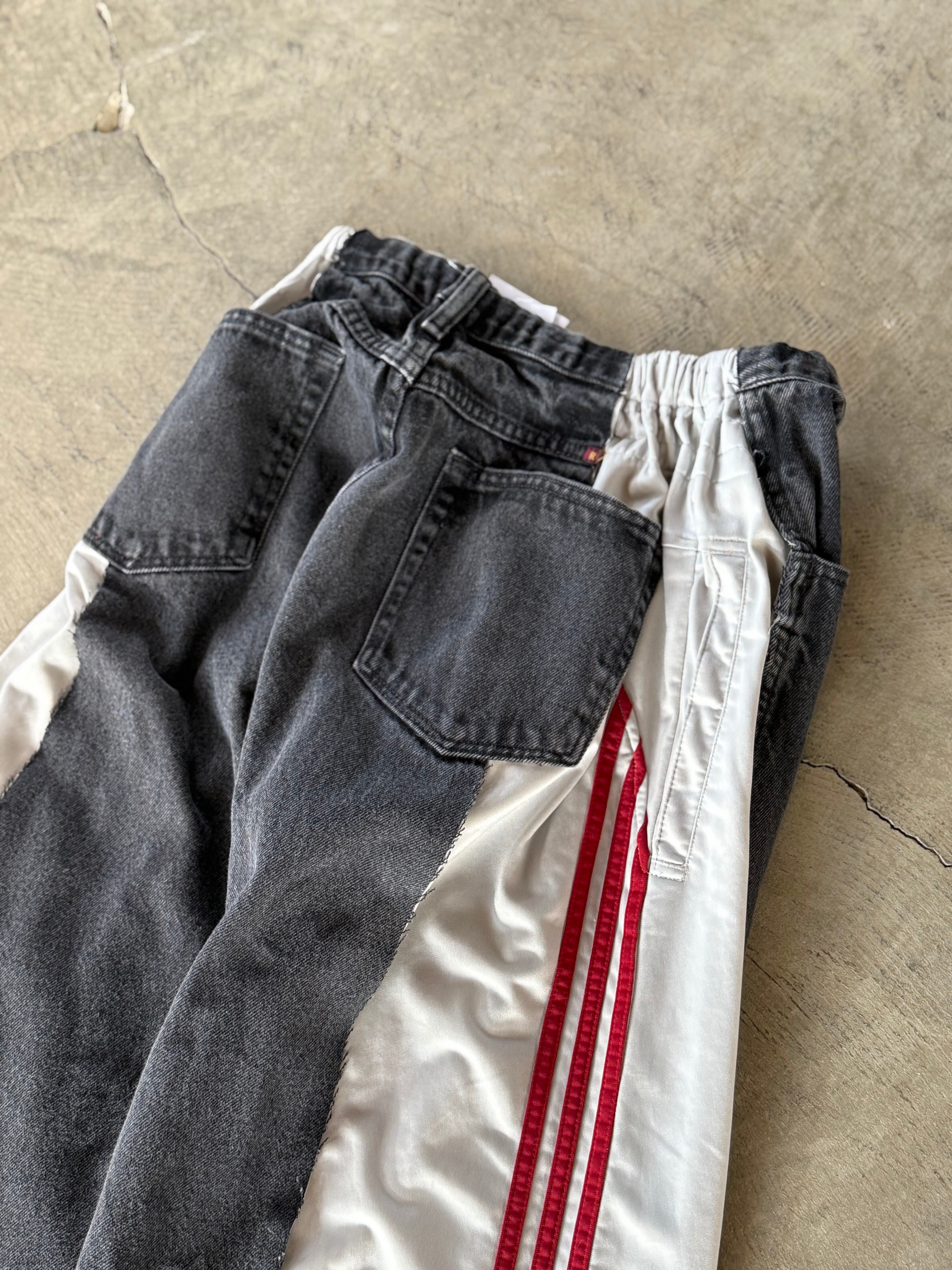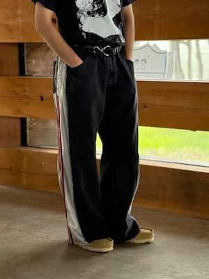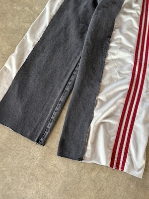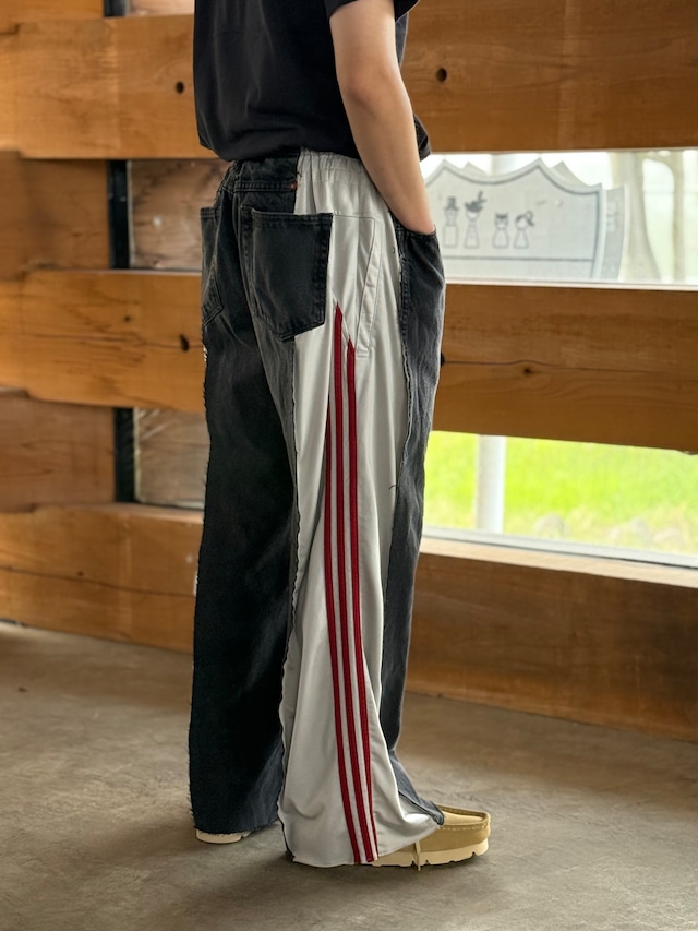 サイドを大胆に切り込んだusedデニムにスポーツジャージをドッキングした1点物。
