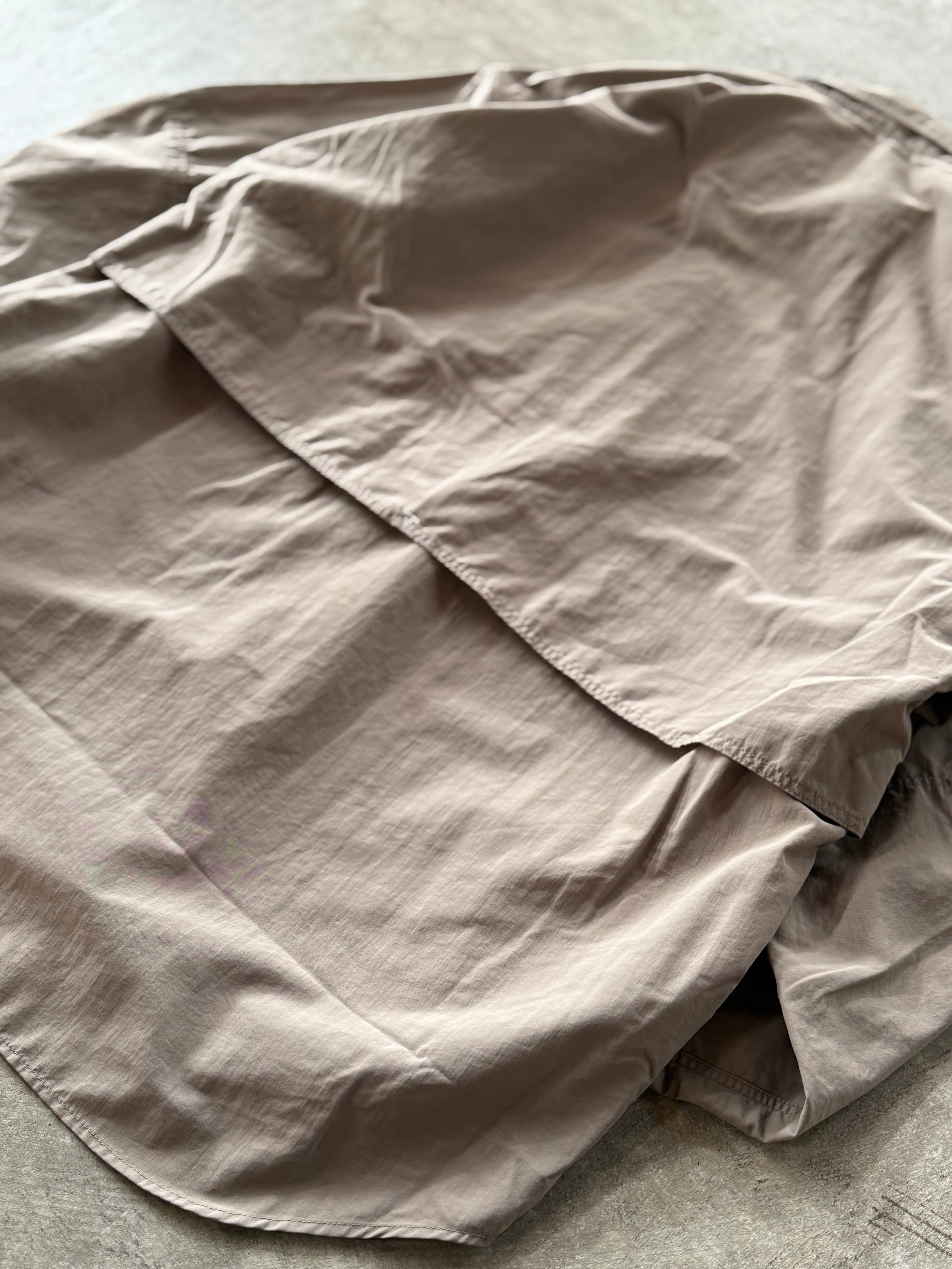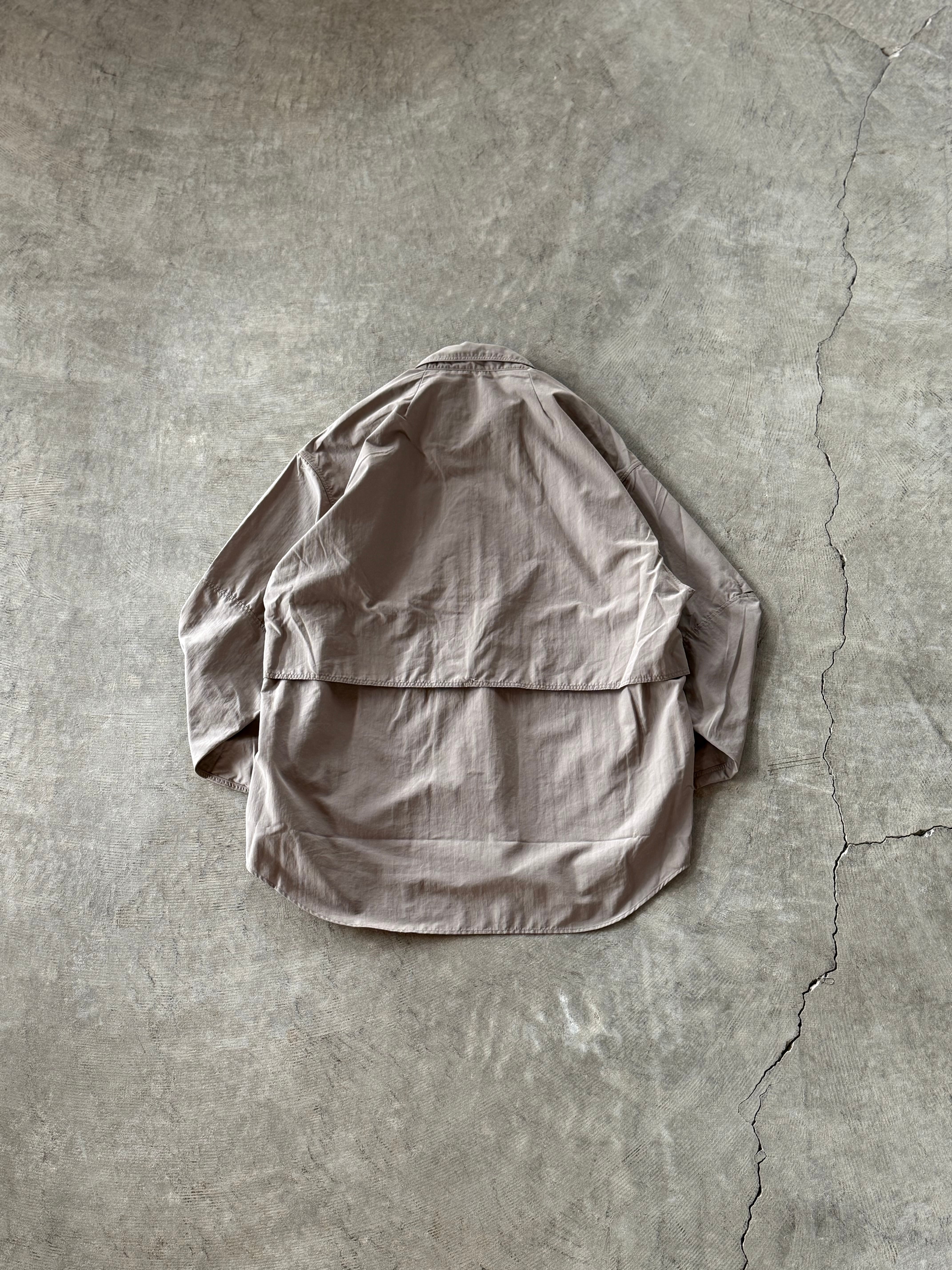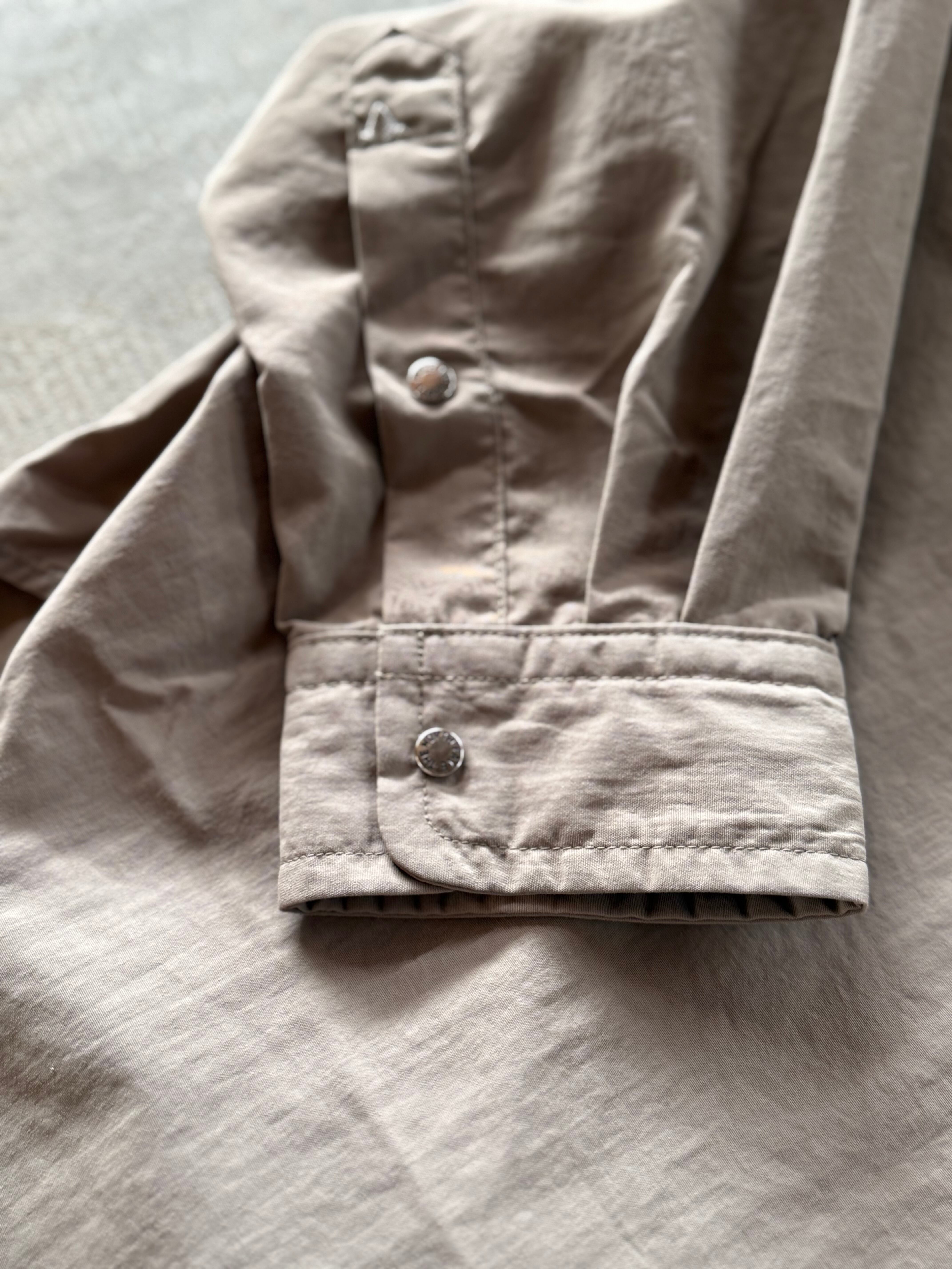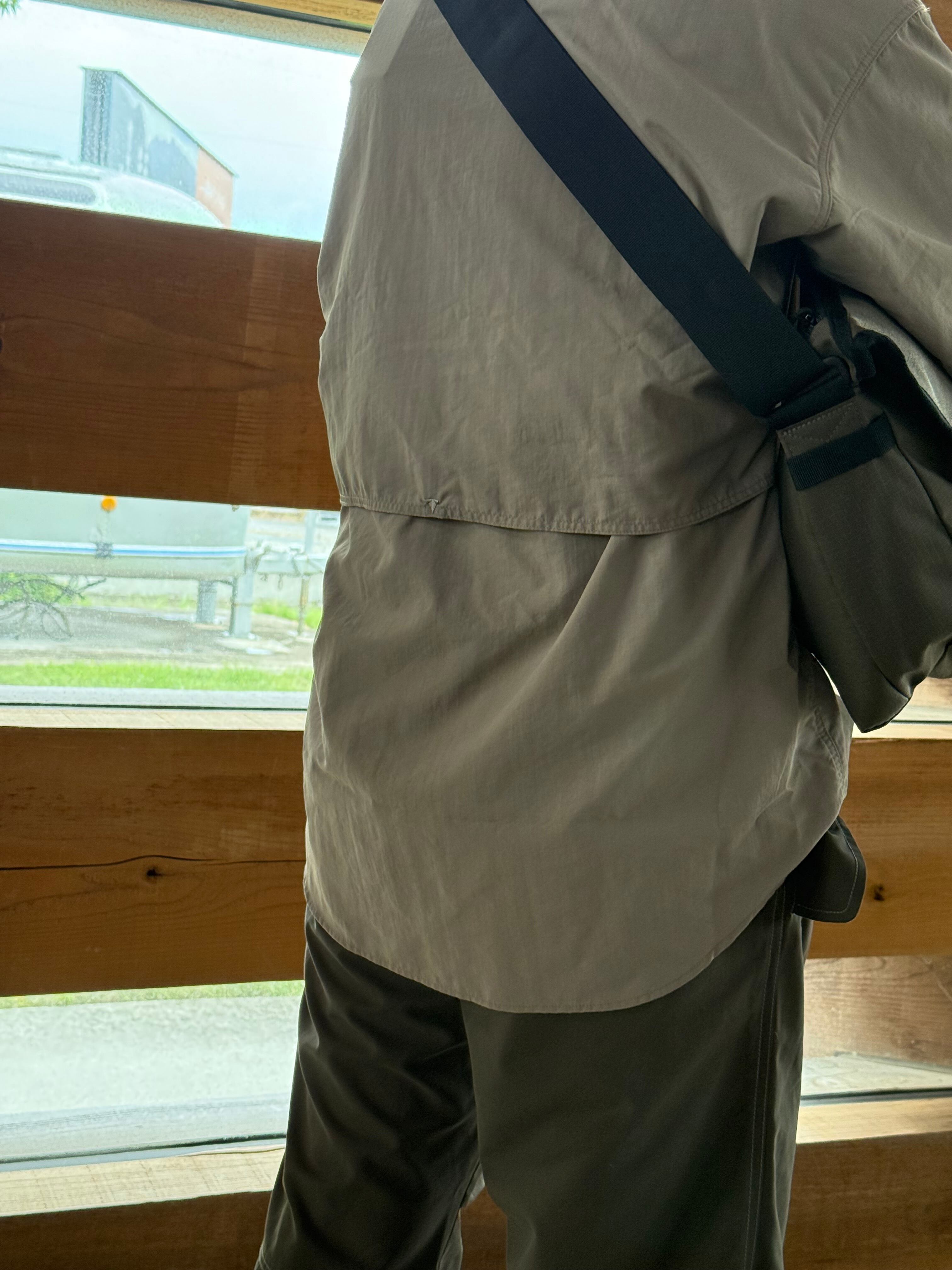 表地にはクラシカルで柔らかな風合いのタスランナイロンを使用。はっ水加工を施し、多少の雨や汚れに対応します。後身頃の裏地は肌離れのよいポリエステルメッシュで、生地が汗で張りつくのを抑えます。袖と背面に配置したベンチレーションは、自転車で走行するときの空気の取り入れを想定した設計。ハーフドーム型の胸ポケットは、収納したものが落ちにくい仕様です。