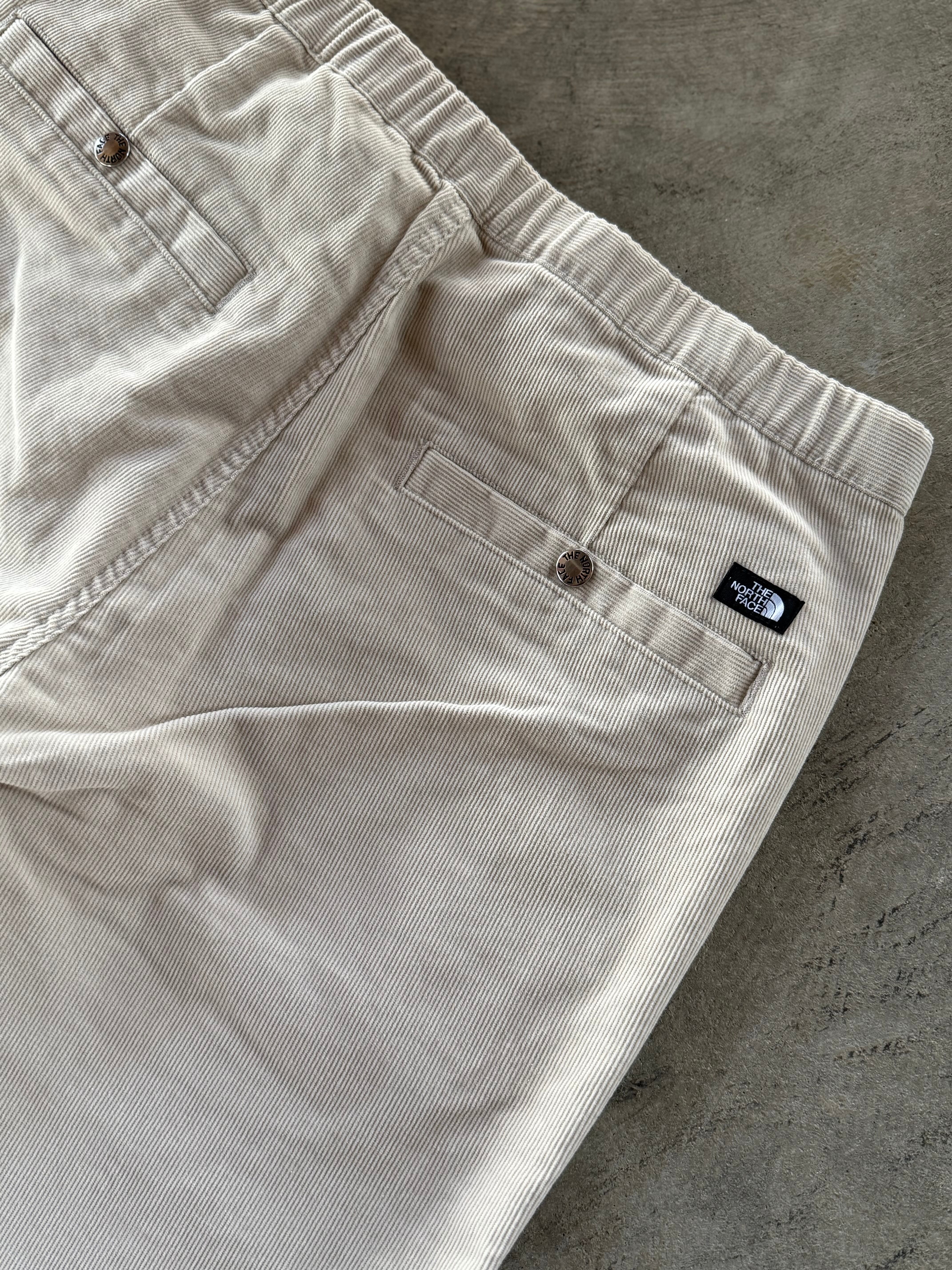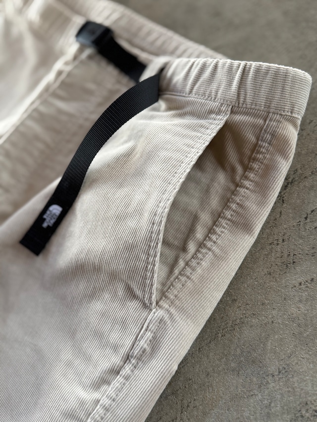 インド産オーガニックコットンと軽量なポリエステル捲縮糸を交織した素材を使用し、適度に伸縮します。THE NORTH FACEの1970~1980年代の製品に多く見られる、縫製部の耐久性を向上しつつデザインのアクセントにもなるアロータック仕様など、クラシカルなディテールを踏襲しています。ウエストは着脱が容易でサイズ調節もしやすいウェビングベルト仕様。両サイドにポケットを配置しています。