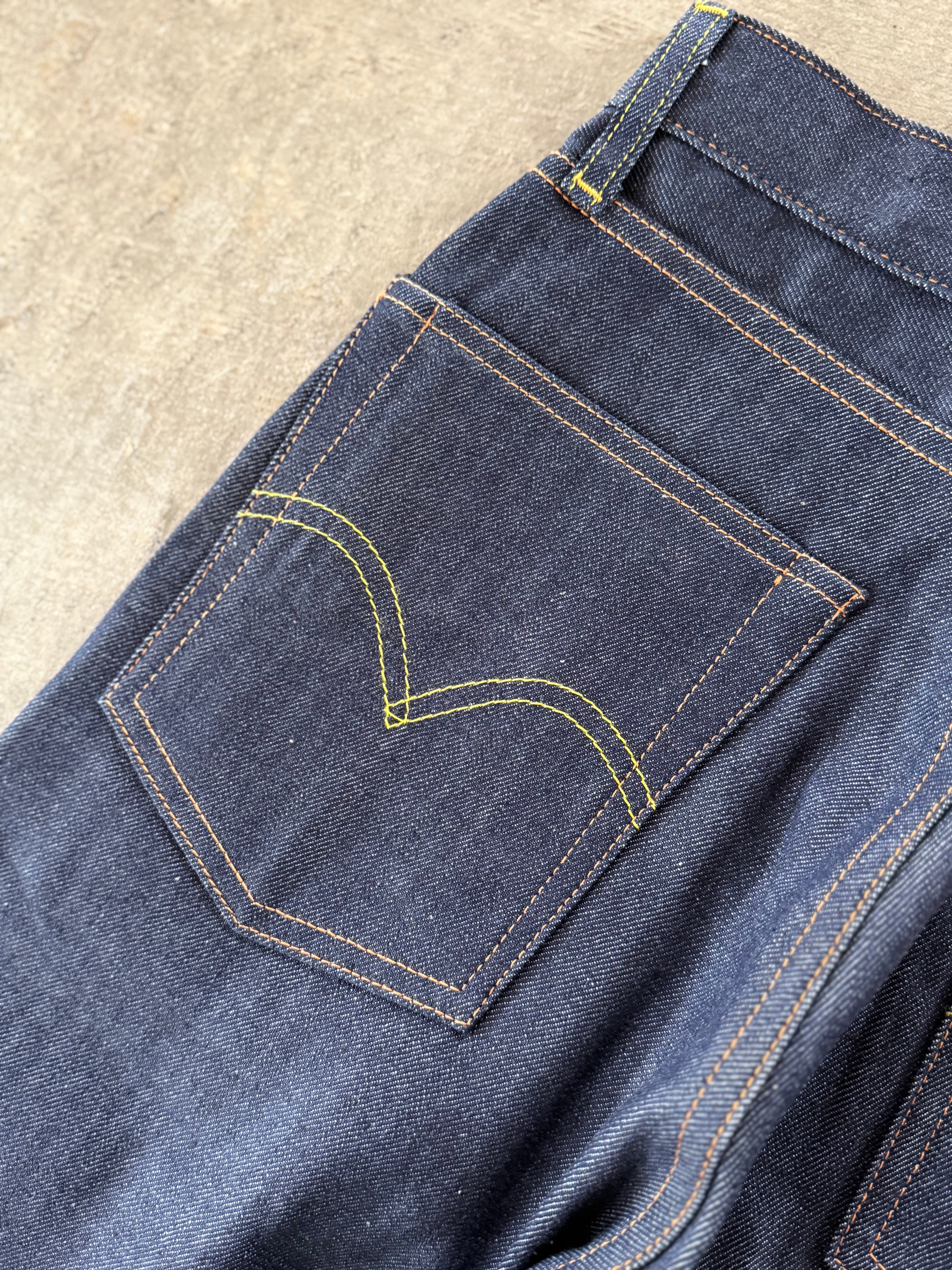 伝統の赤いステッチの代わりにピンク色の糸を採用したピンク・セルヴィッジが特徴です。