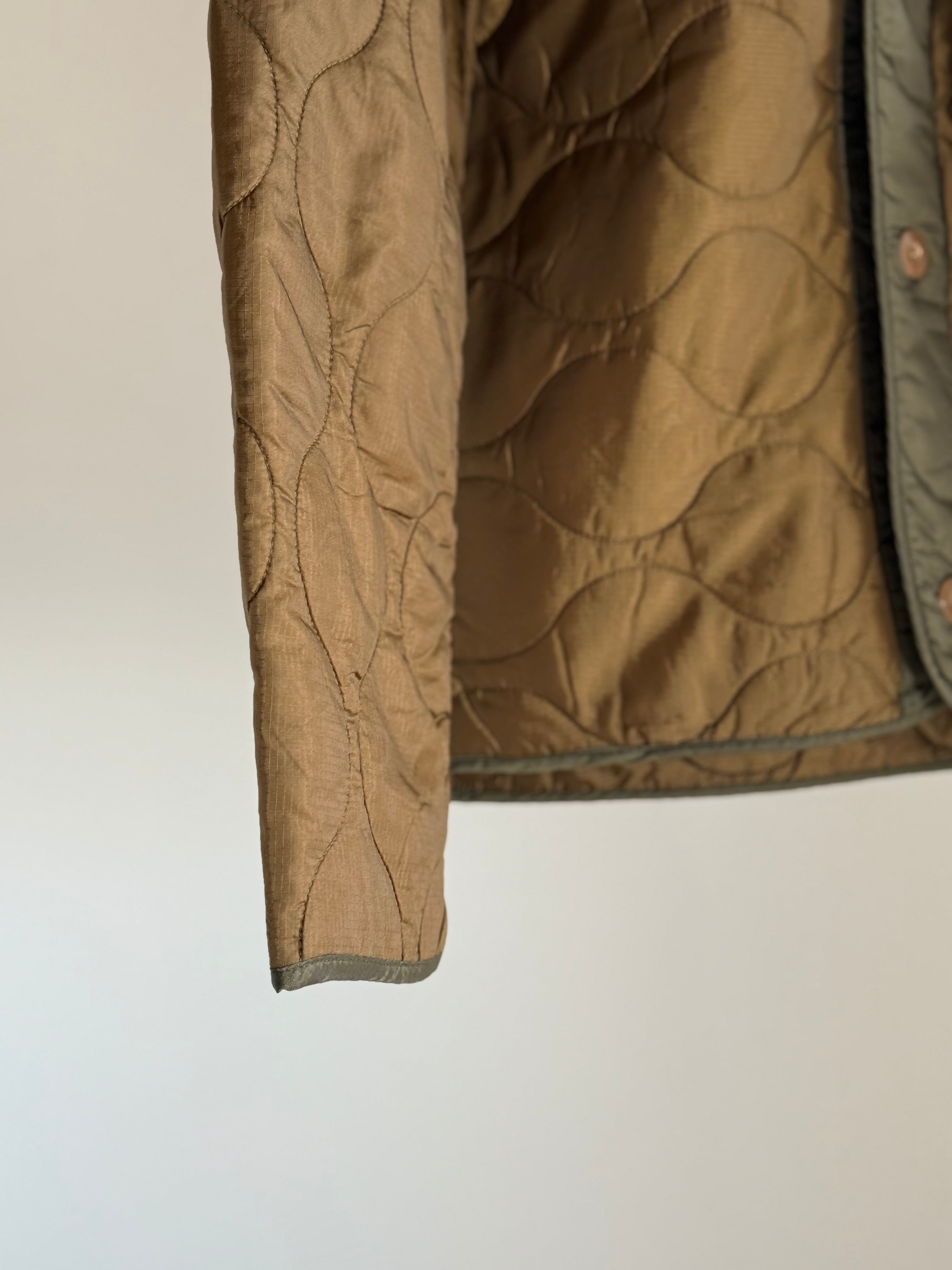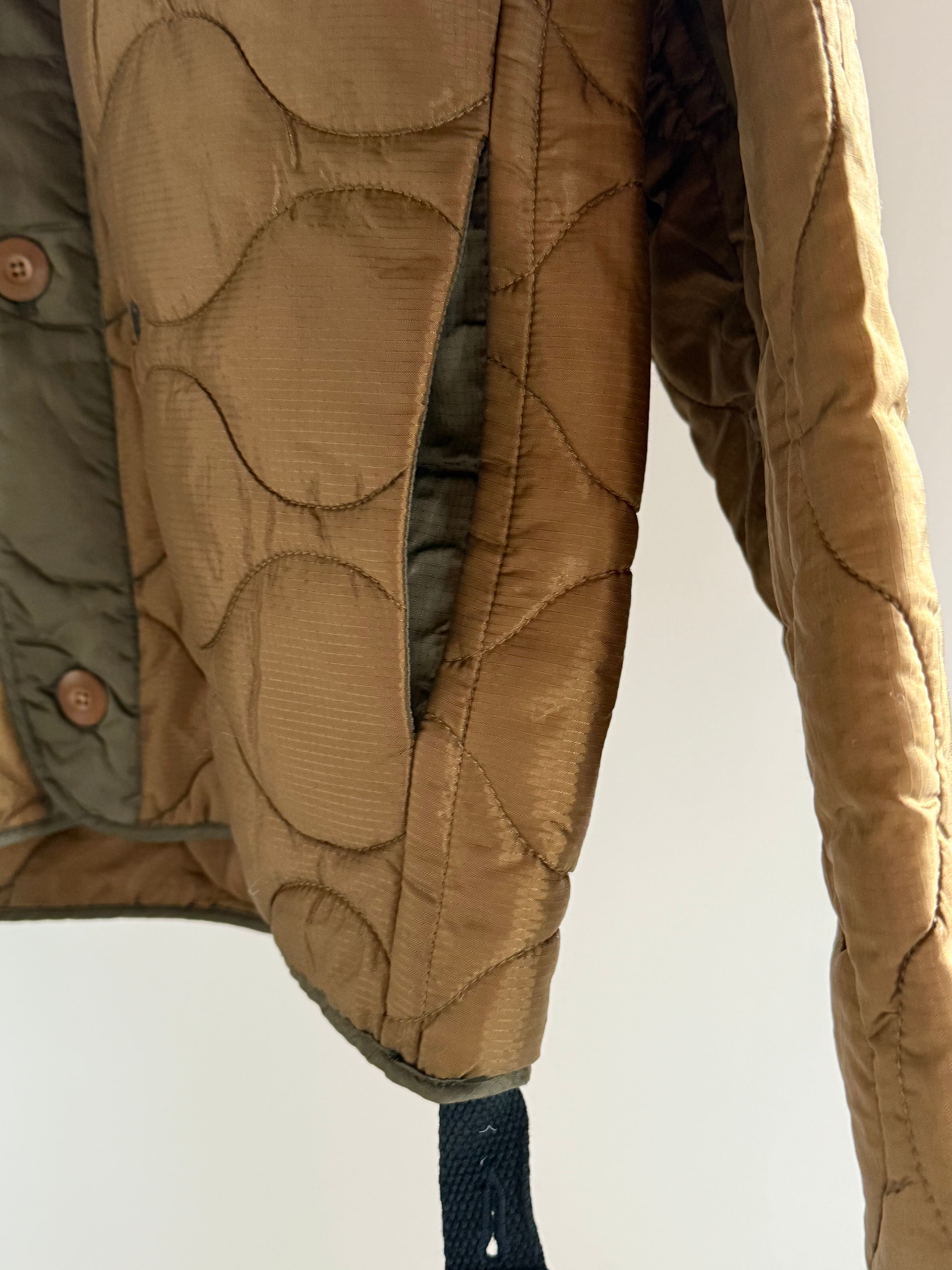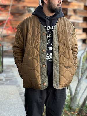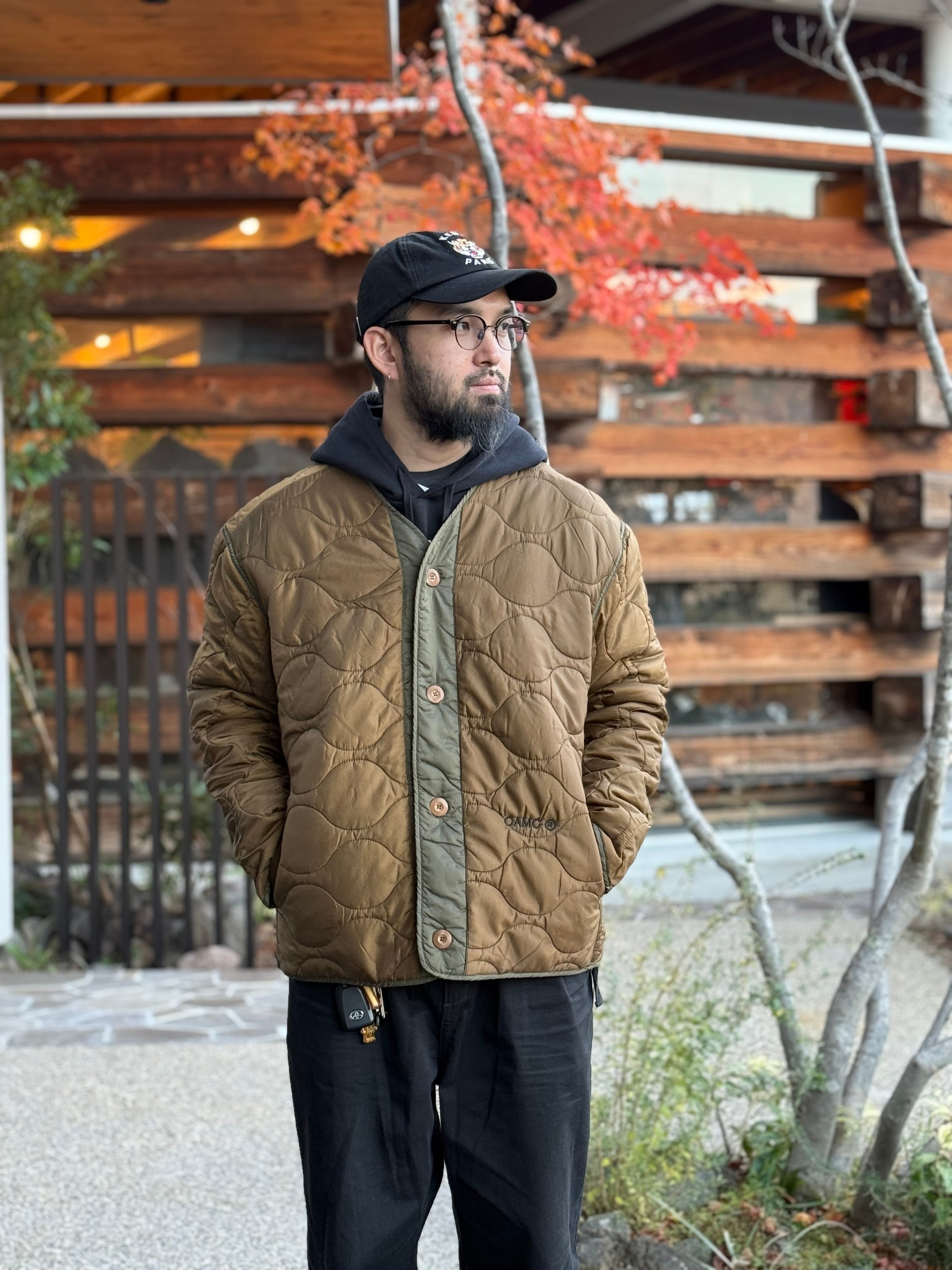 リラックスフィットのシルエットで、マットなナイロン素材にダイヤ型のステッチを施した一着です。