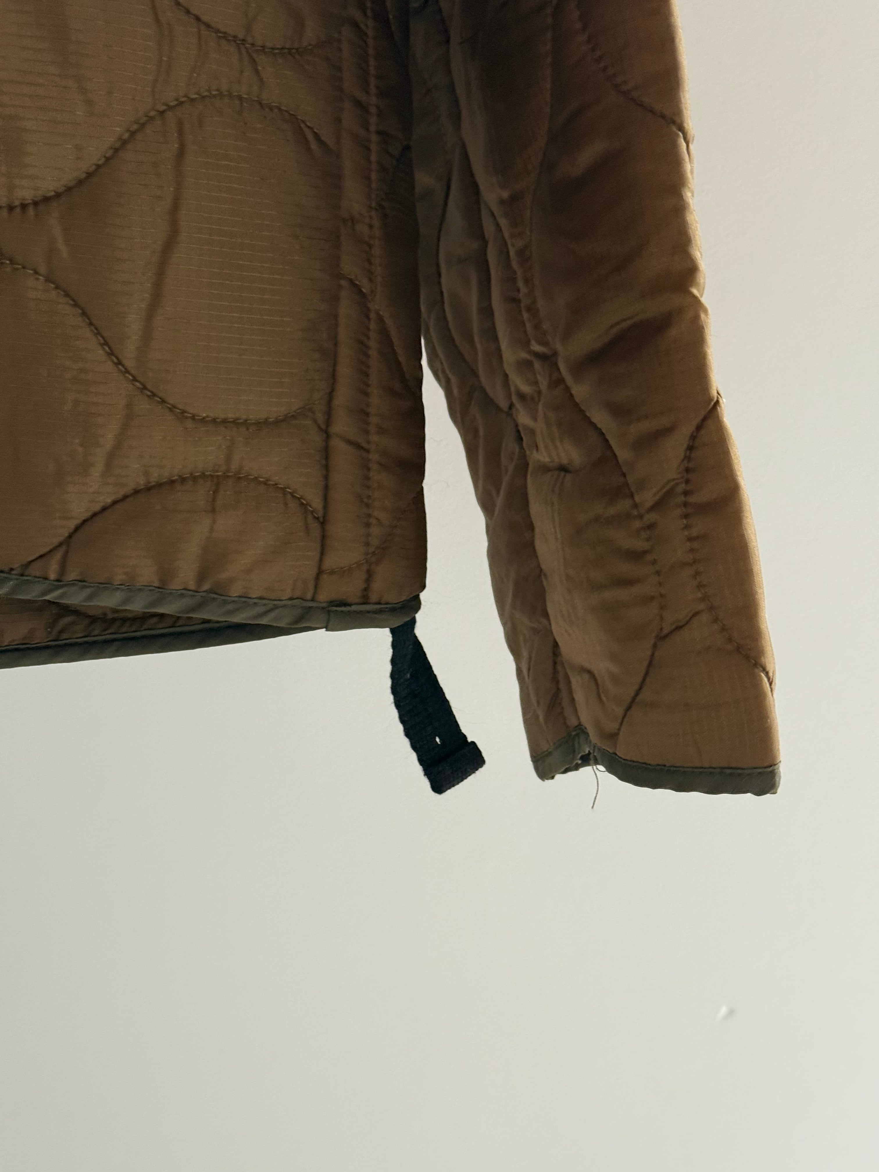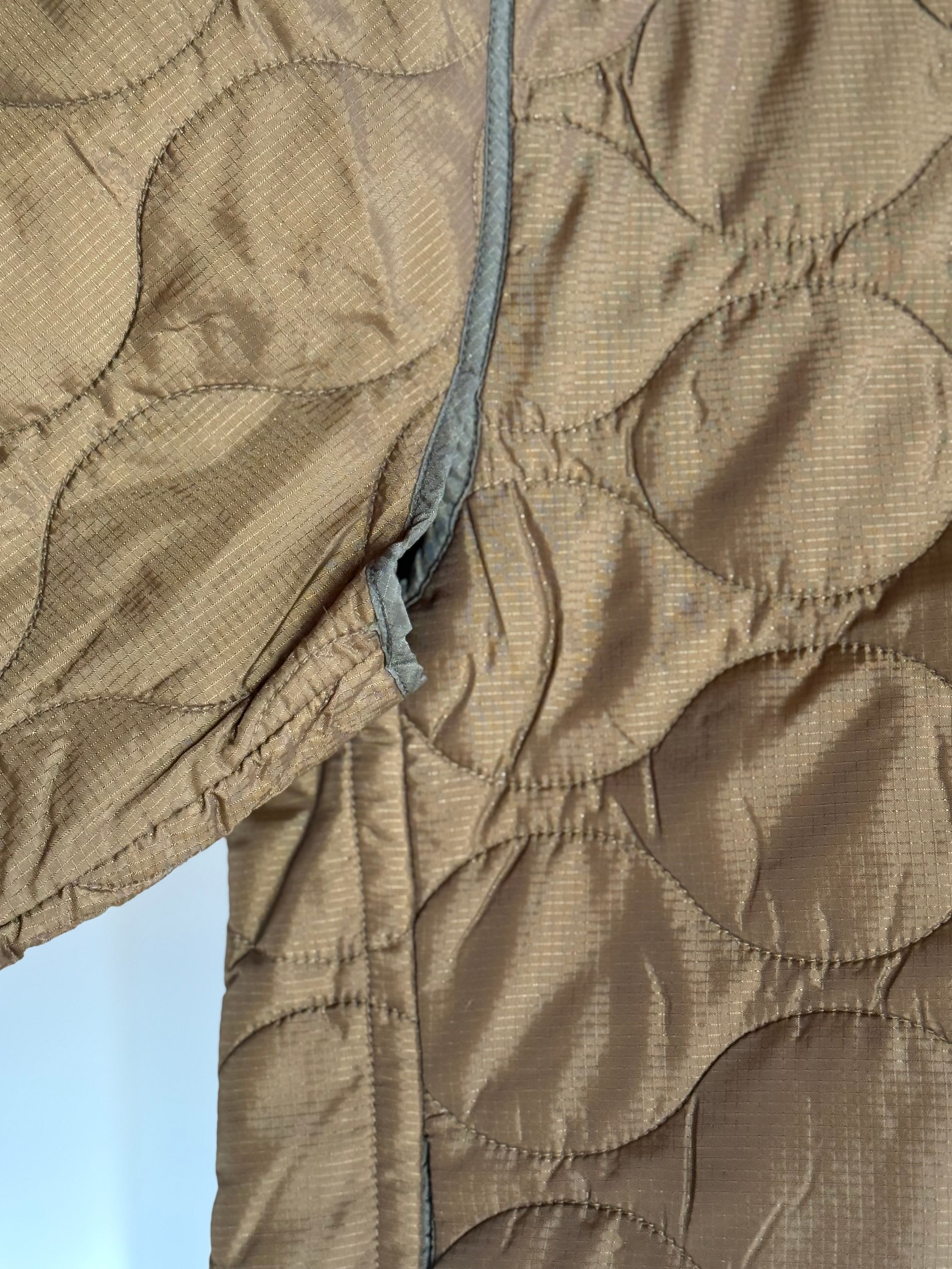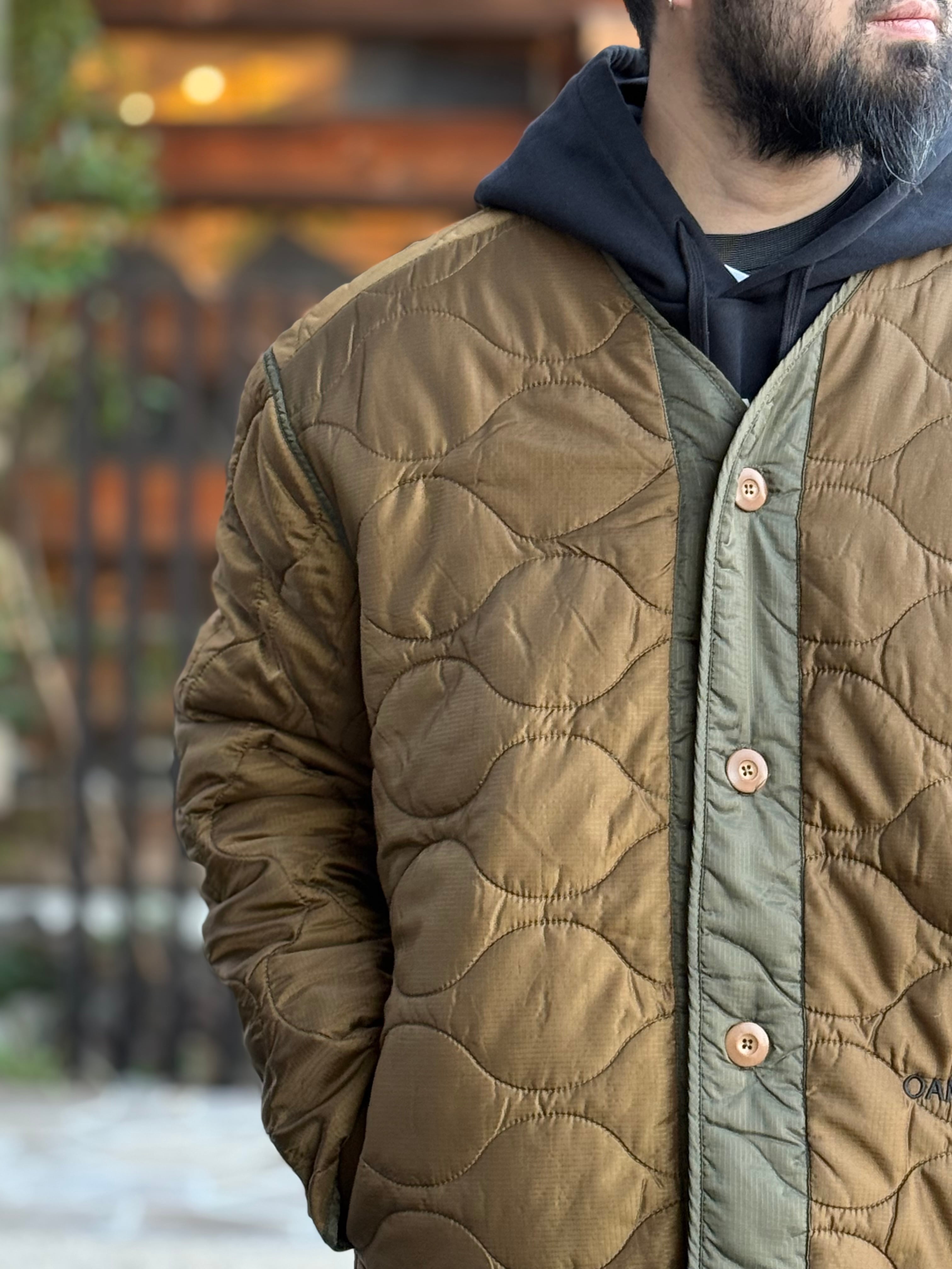 リラックスフィットのシルエットで、マットなナイロン素材にダイヤ型のステッチを施した一着です。