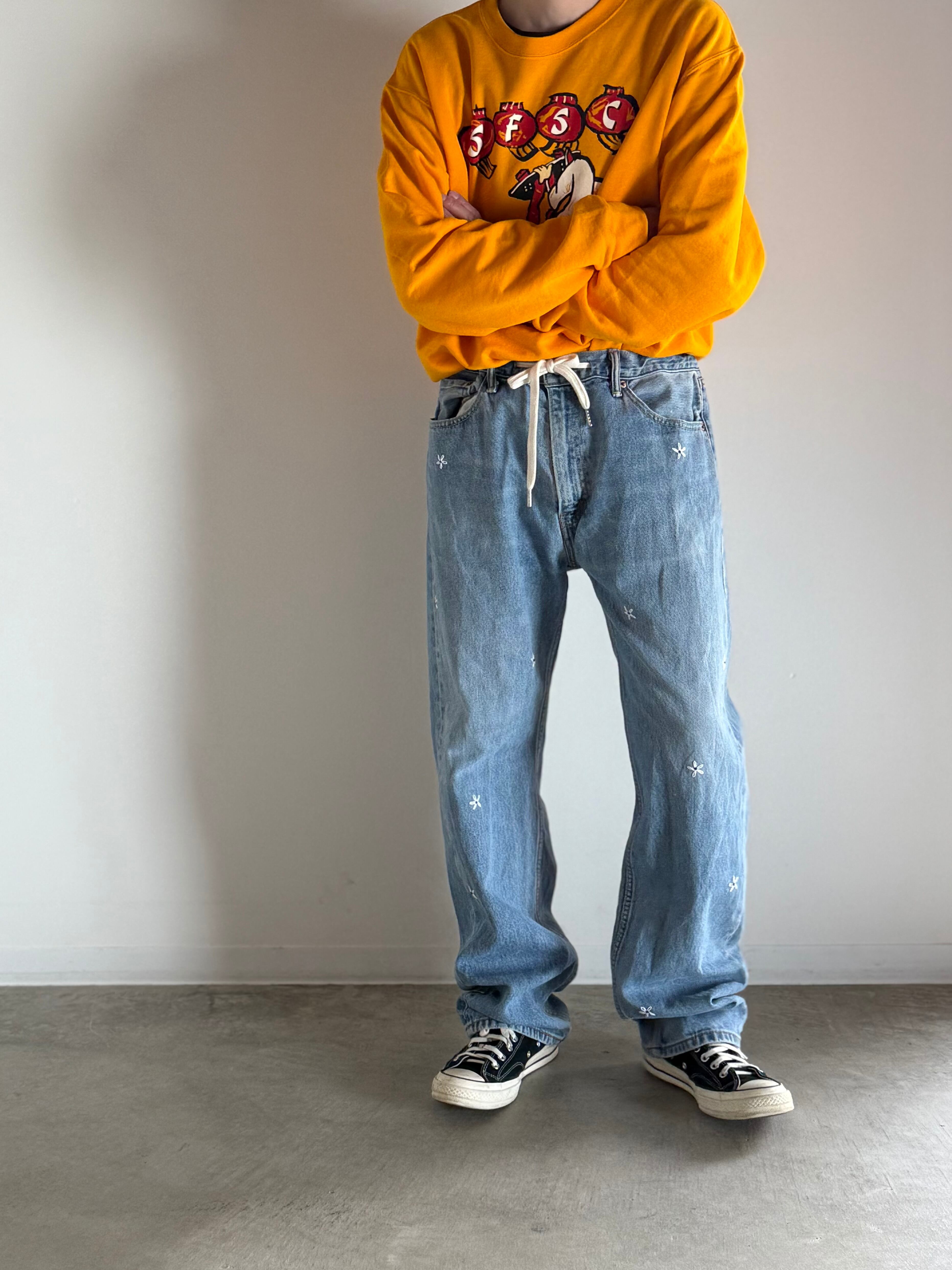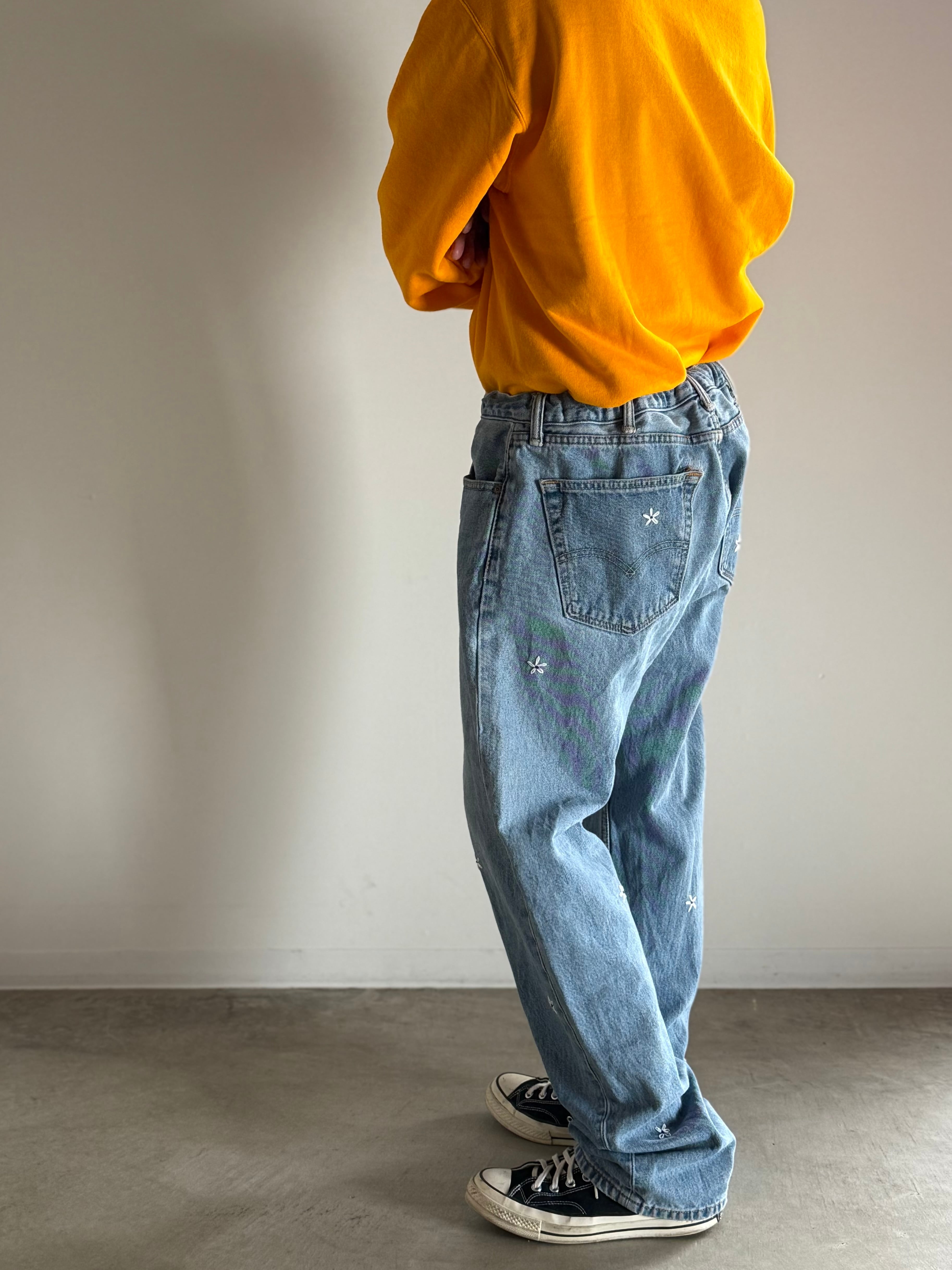 usedのデニムパンツにフラワーの刺繡した可愛らしい1着!