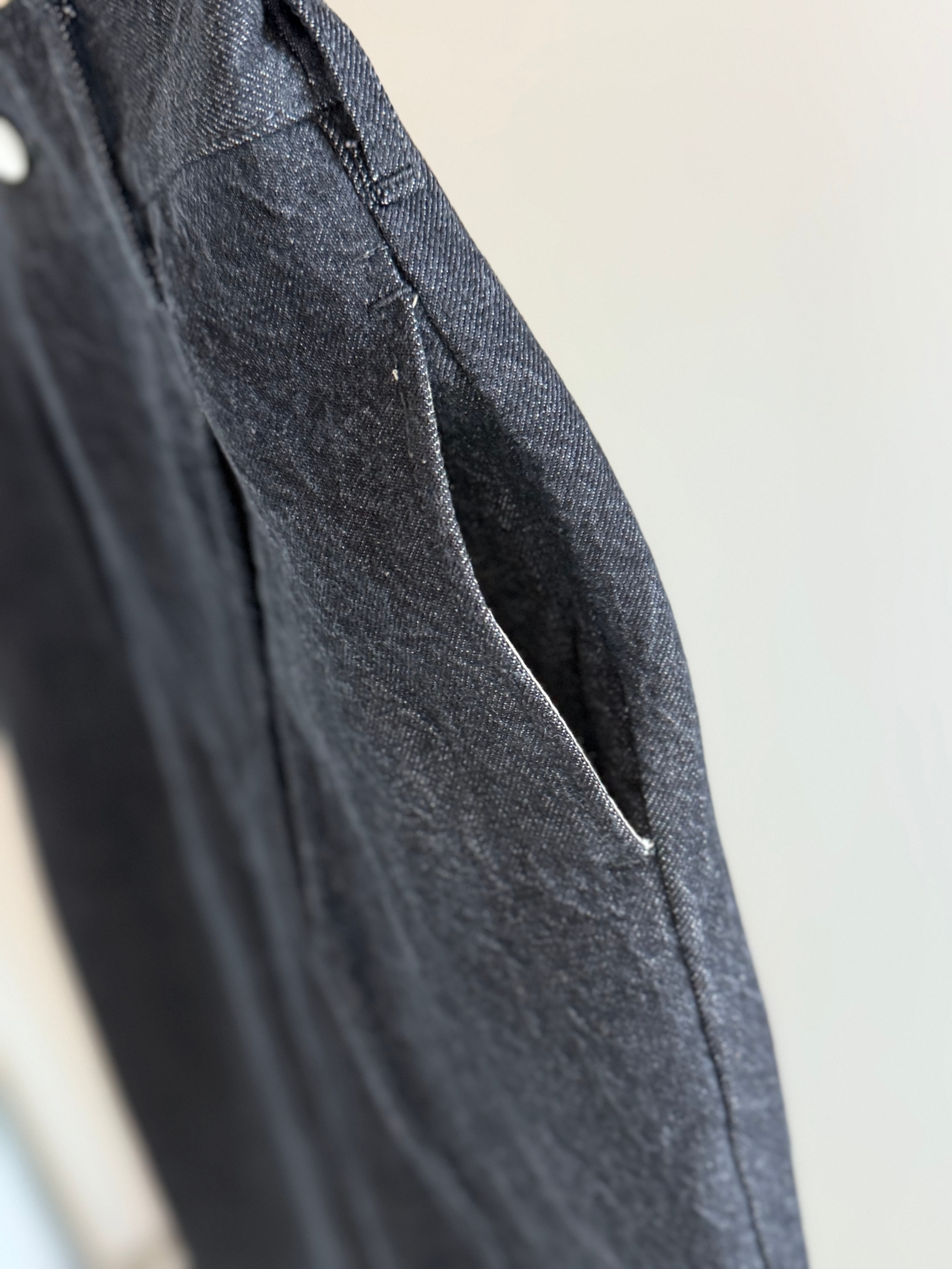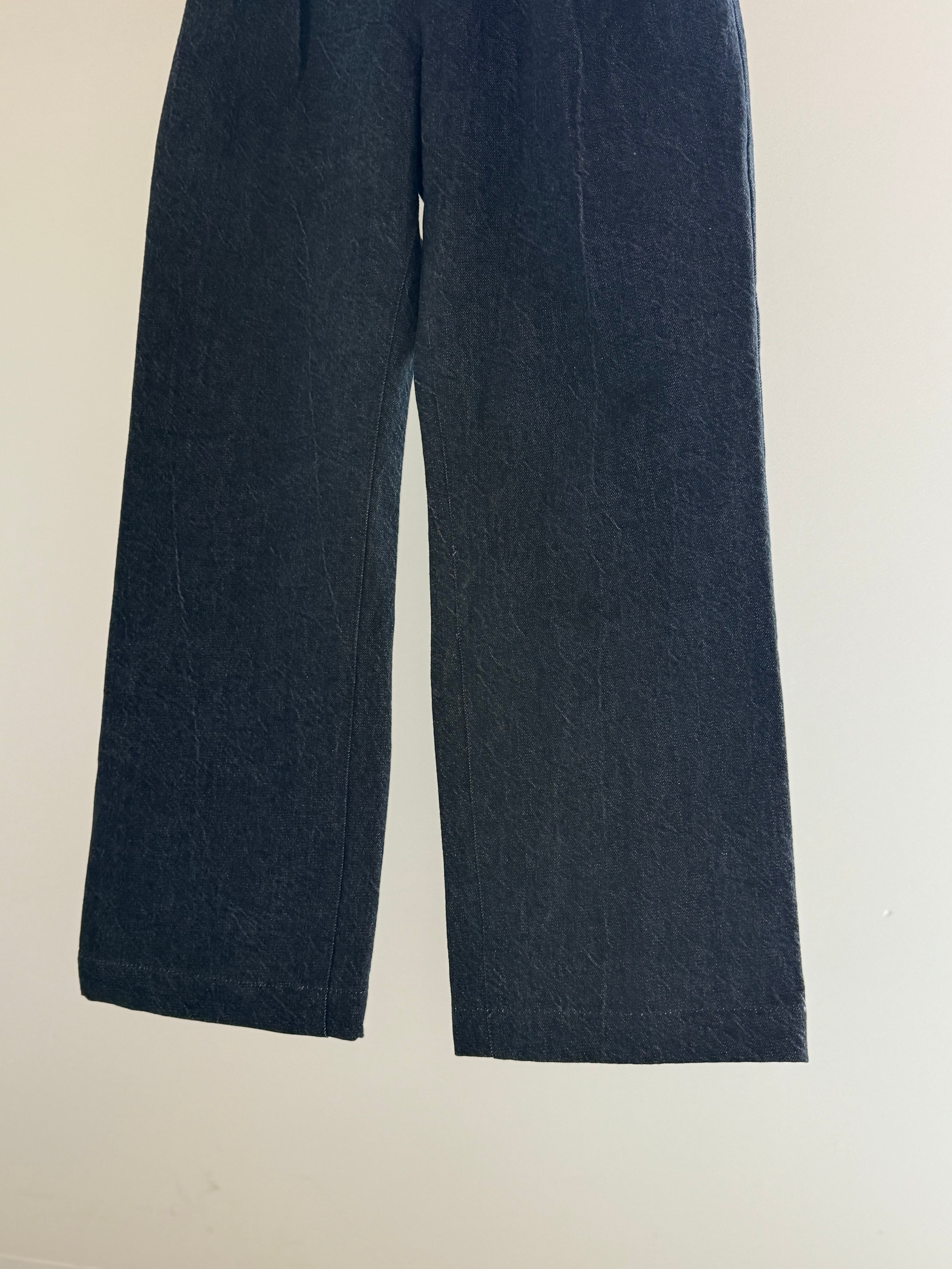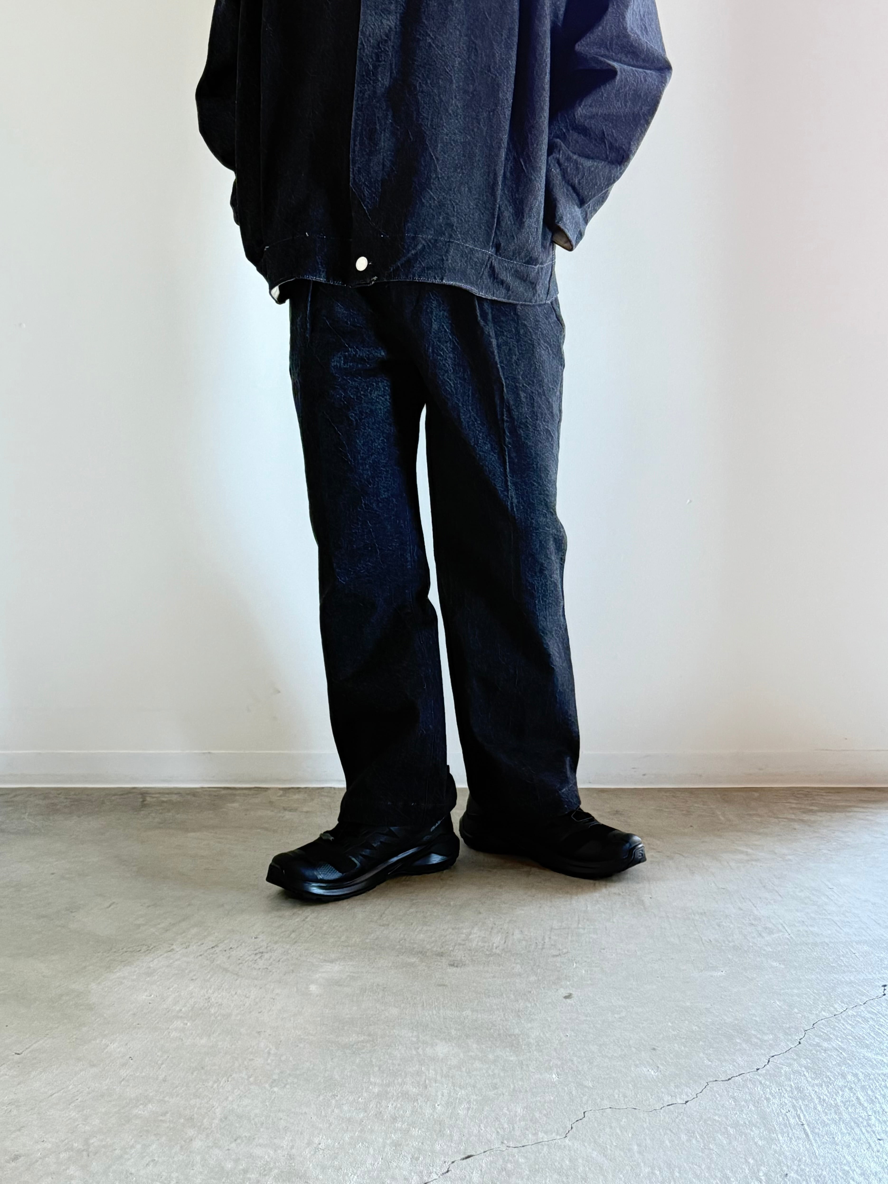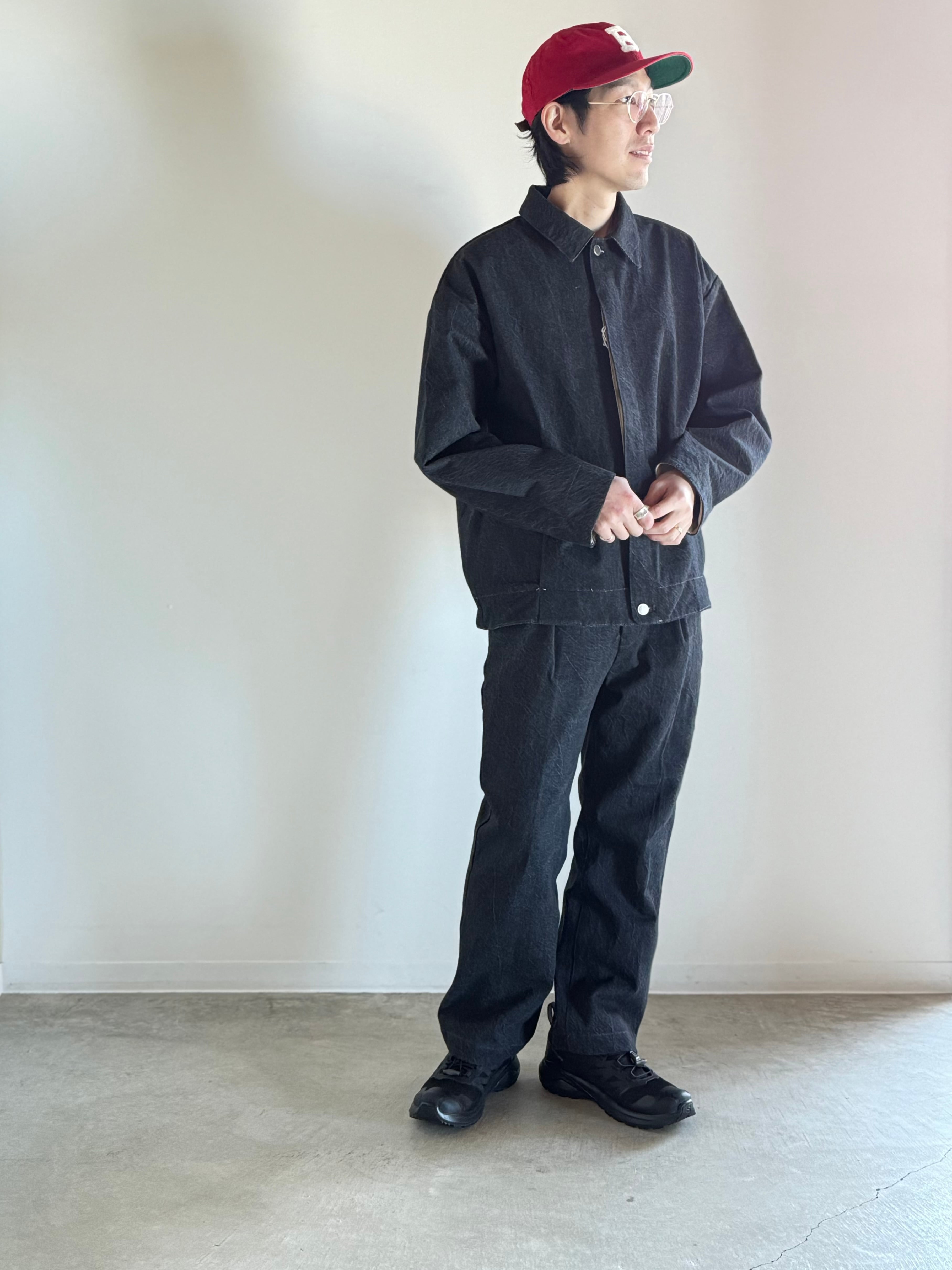 腰周りは履きやすいゆとりをもたせ膝から下をストンとストレートに落とす事で脚長効果も期待できるシルエットになっており深めのプリーツやセンタープレス仕上げによりスラックスのようなアイテムながらデニム素材とのミスマッチが面白い一本です!