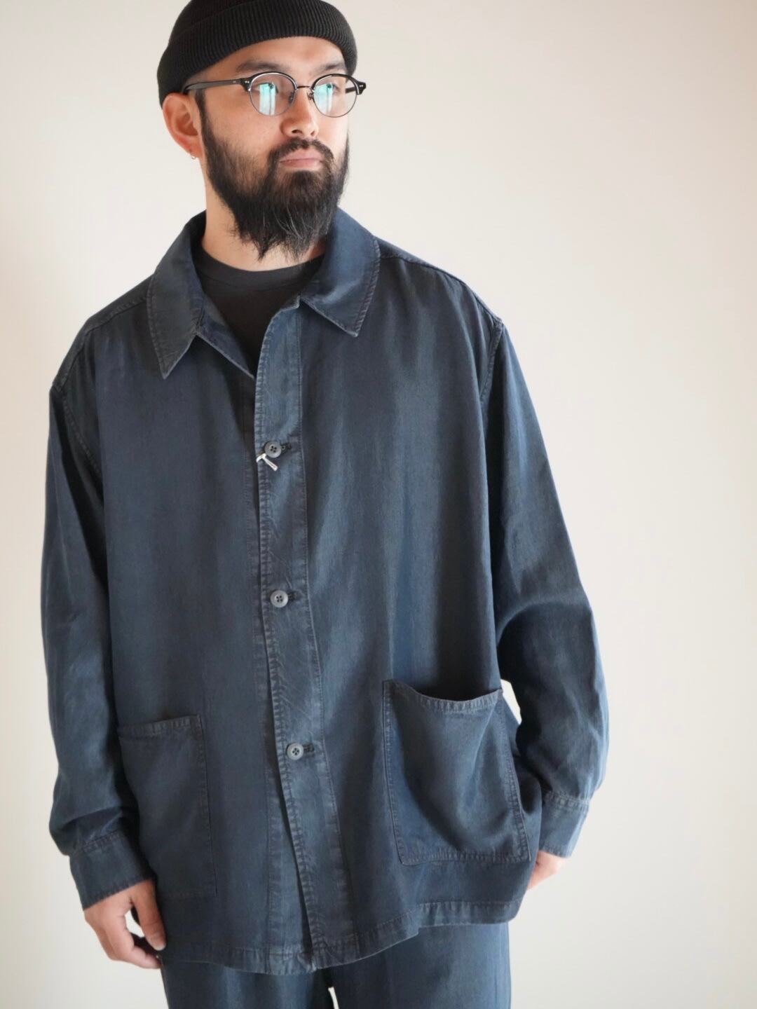 落ち着いたデザインと適度なゆとりのあるサイズ感で、様々なインナーとのレイヤードを楽しめる万能な一枚。