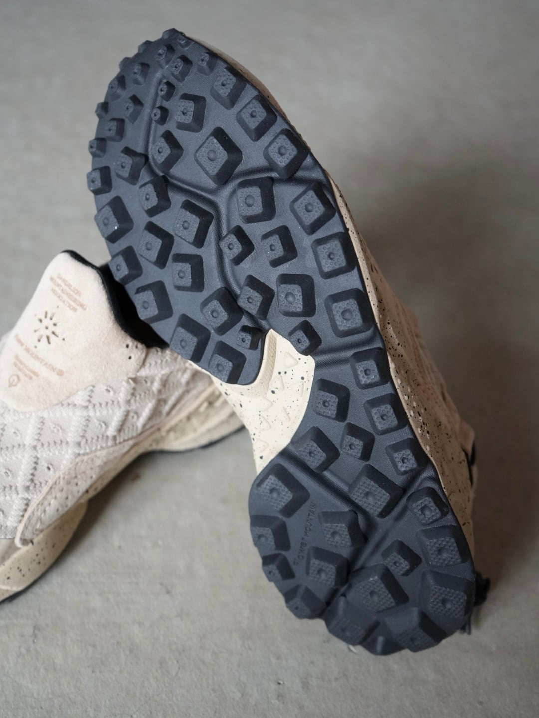 アッパーのひし形メッシュは伸縮性と形状の安定性に優れ、通気性も確保します。