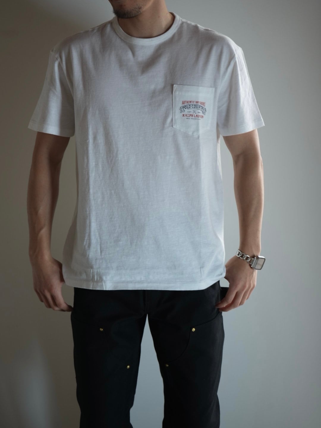 胸元のポケットが特徴的なクルーネックTシャツとなっております。