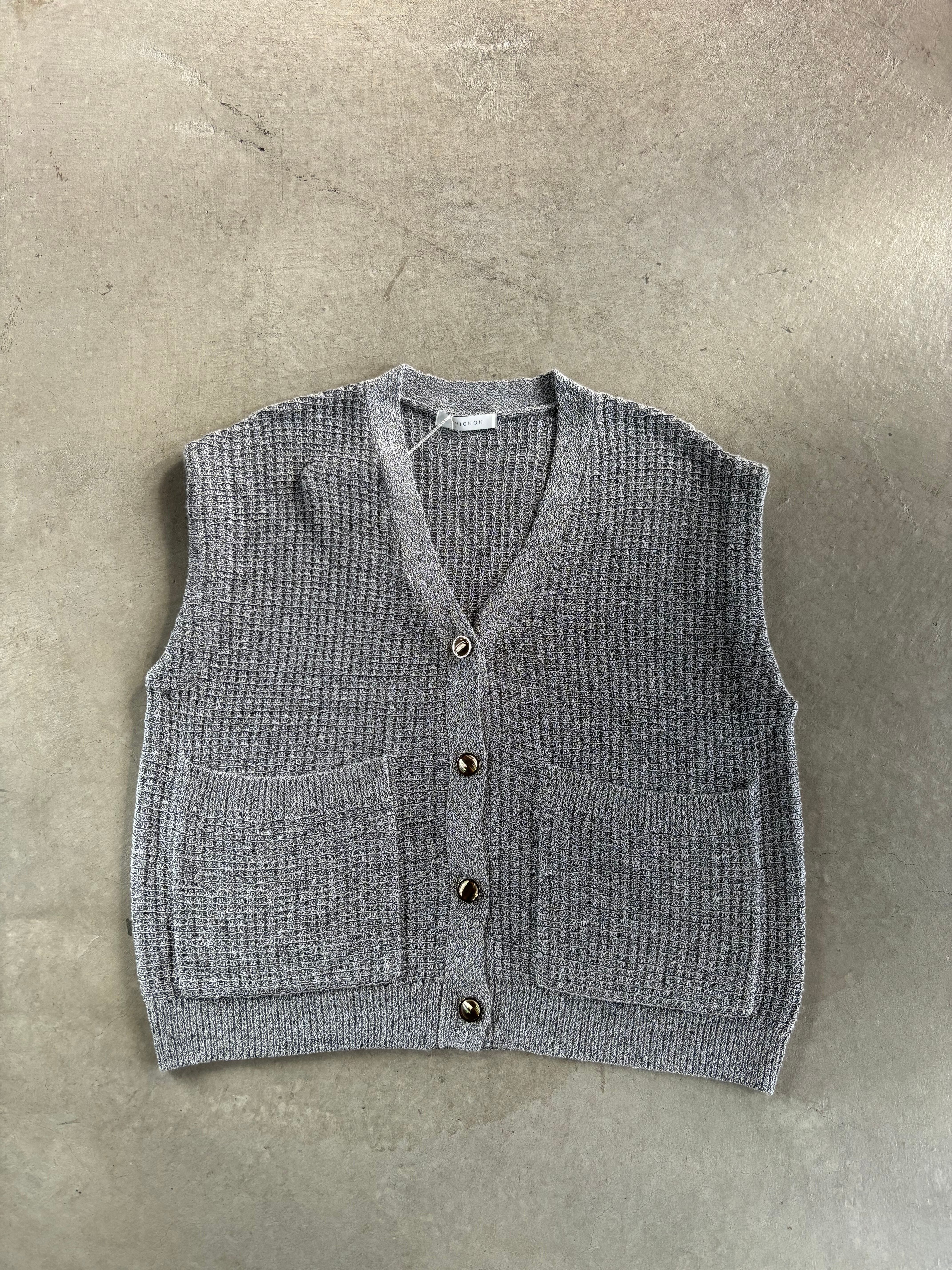 ワッフル組織のツイード風のニットベストです。空気を含んだようなボリュームのあるファンシーヤーンの糸をセレクトし、ワッフル編みで作成することでニットの表情感も楽しんでいただけるアイテムに。金ボタンを配すことでクラシカルな印象に纏め、短丈の設計でトレンド感を演出しました。