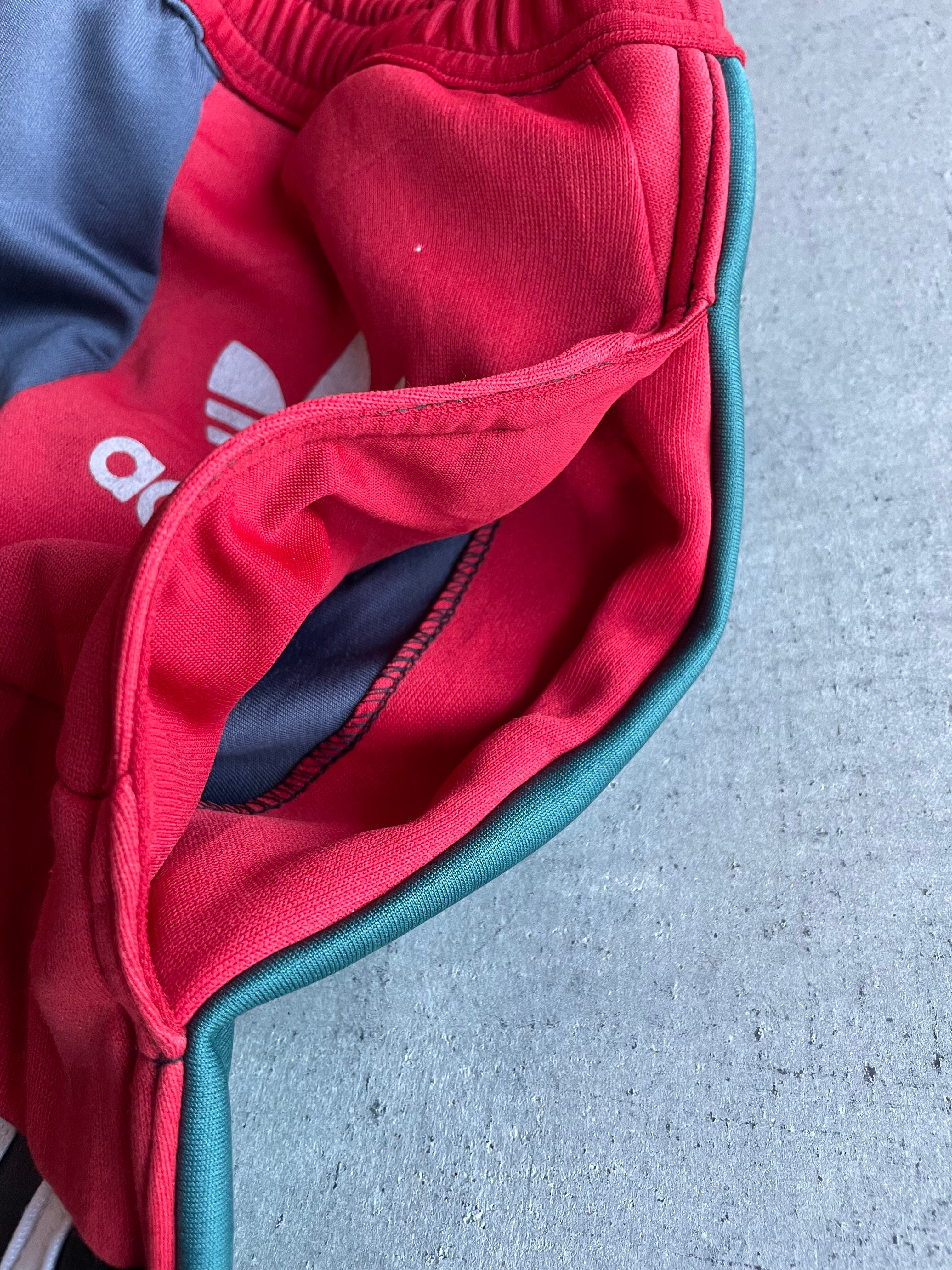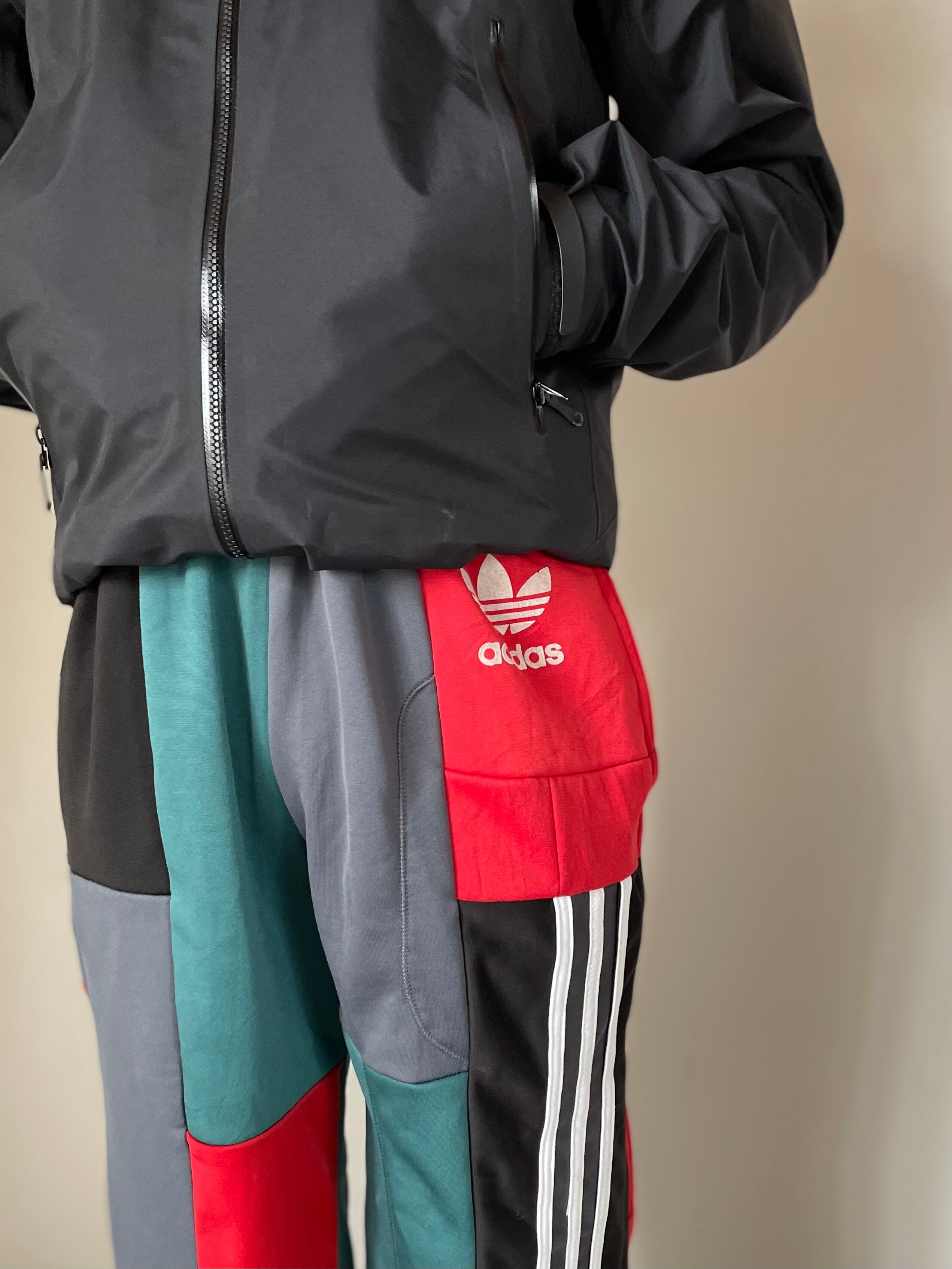 usedのスポーツジャージをバラし、パッチワークにしてイージータイプのパンツに